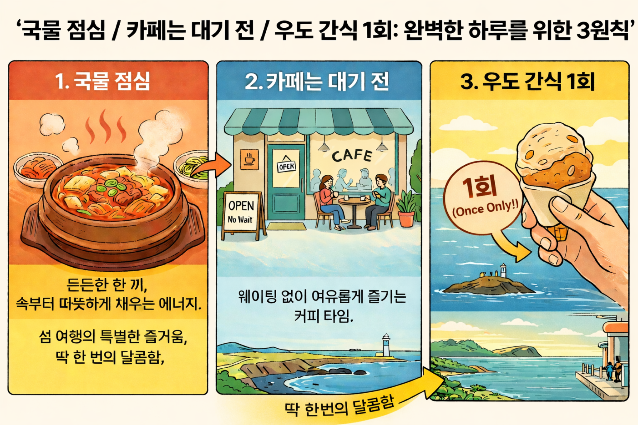 | 11:30 전후 | 성산포 → 우도 입도 | 우도 점심은 “국물/한식 or 톳짜장”처럼 실패 확률 낮게 |