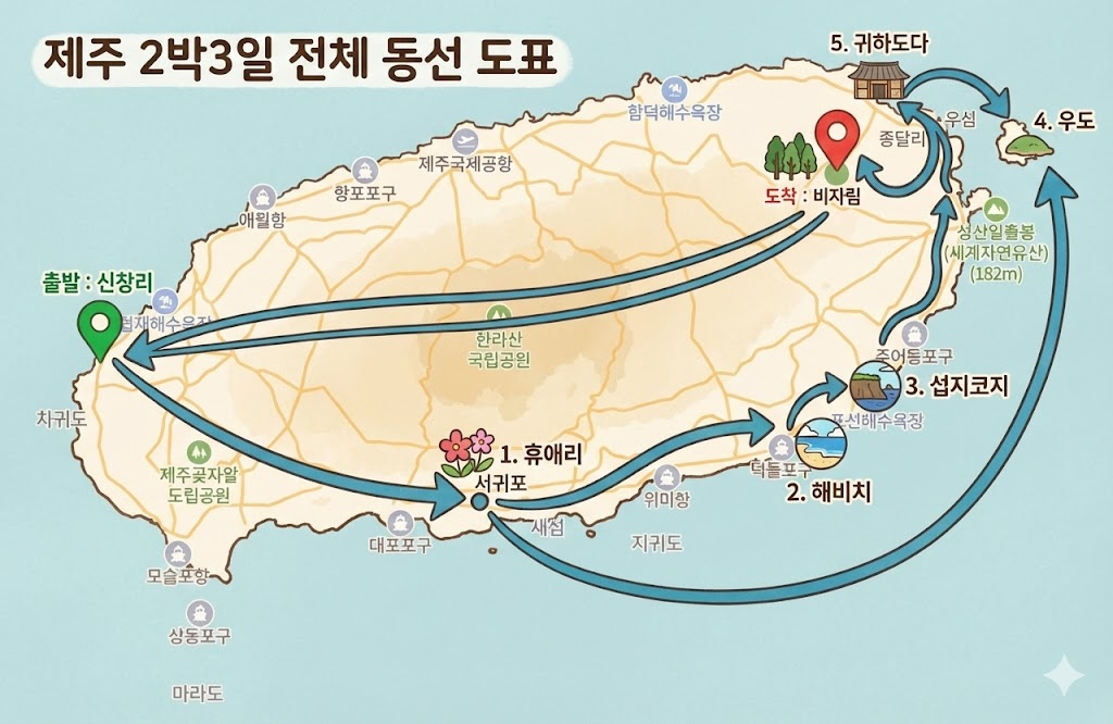 | 09:30~10:00 | 신창리 한경도서관 출발 → 서귀포 이동 | 첫날은 이동+정비 비중을 높이면 전체 컨디션이 살아납니다. |
