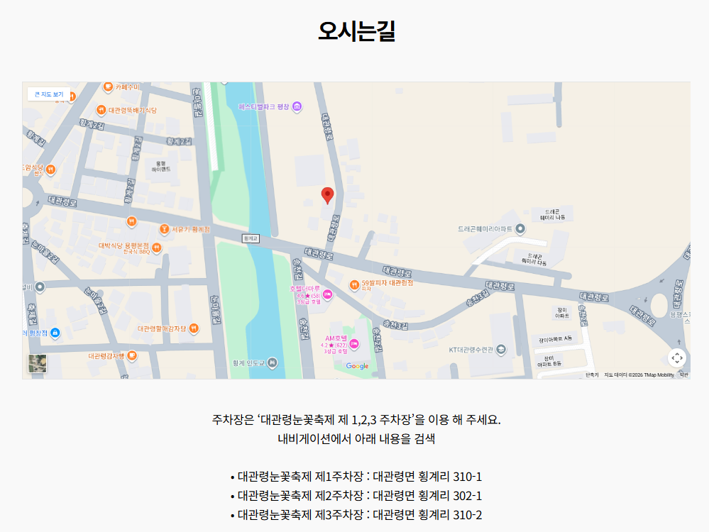 - 목적지 검색: ‘대관령 눈꽃축제 주차장’ 또는 ‘강원도 평창군 대관령면 송천리’
